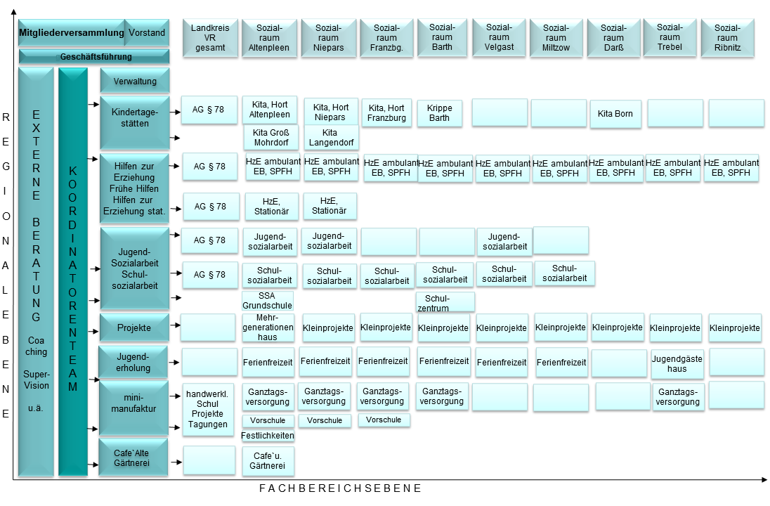 Seine nunmehr ca. 160 fest angestellten Mitarbeiter*innen in den o.g. Arbeitsbereichen werden von einem ehrenamtlichen Vorstand über die Geschäftsführerin geführt. Der Wirkungsbereich des Vereins, in dem derzeit ca. 42.000 Einwohner*innen leben, erstreckt sich im Wesentlichen auf den ländlichen Raum um die Hansestadt Stralsund. Die acht Amtsbereiche des Landkreises stellen für uns Sozialräume dar, in denen die Mitarbeiter*innen in regionalorientierten Teams arbeiten, die insbesondere die Kenntnisse der Sozialräume integrieren, und so wiederum leistungsbereichs- und sozialraumübergreifende Angebote strukturieren, so dass möglichst alle Ressourcen nutzbar gemacht werden können.